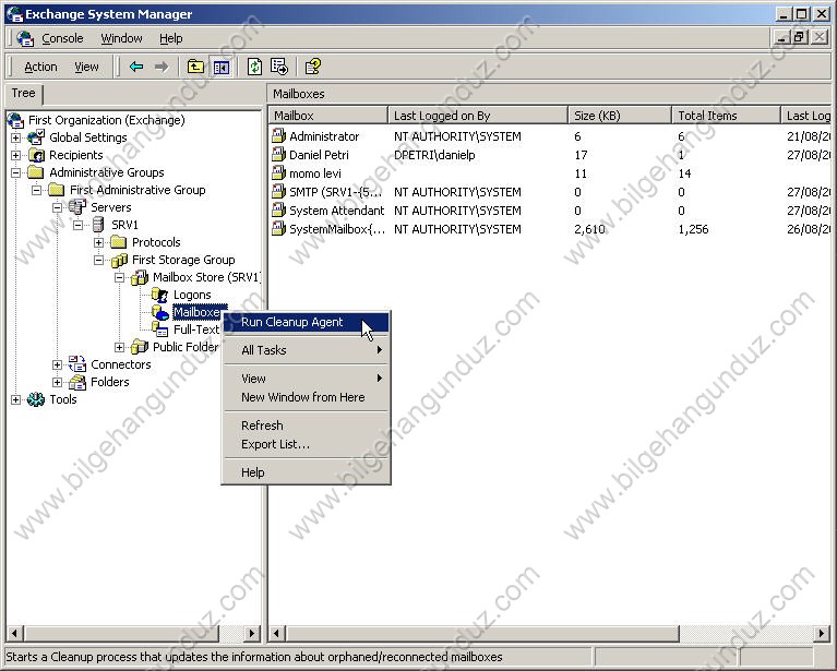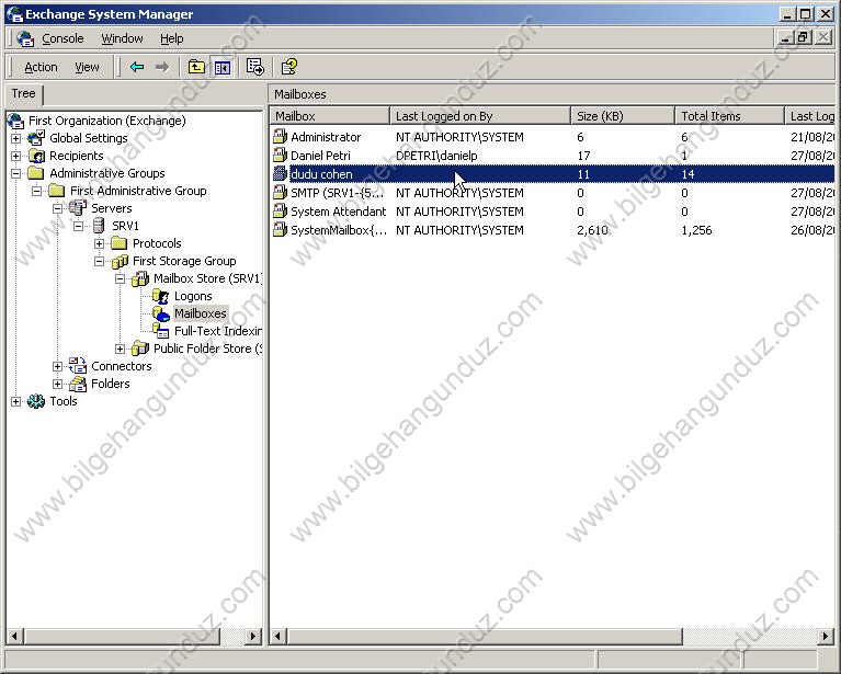 - Exchange System Manager açıyoruz mailbox store üstüne geliyoruz