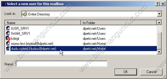- Çıkan ekrandan bu mailbox hangi kullanıcı ile eşleşecekse onu seçiyoruz ve OK tıklıyoruz.